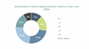 2025 LIB offers detailed insights into Chair and NED fee levels and on the issues individual directors across 14 business sectors see as being the most important, with the companies broken down into seven different turnover categories (from under £10m to over £3bn). The pie chart below shows the distribution of board appointments held by Chairs and NEDs. Among participants in 2025 LIB, nearly half hold four to five Chair/NED appointments.
